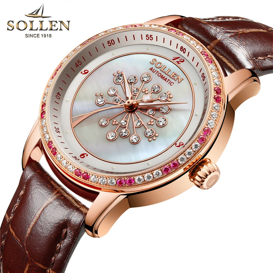 New SOLLEN Women Watches Luxury Brand Ladies Automatic Mechanical Watch Women Diamond Mother Pearl Dial