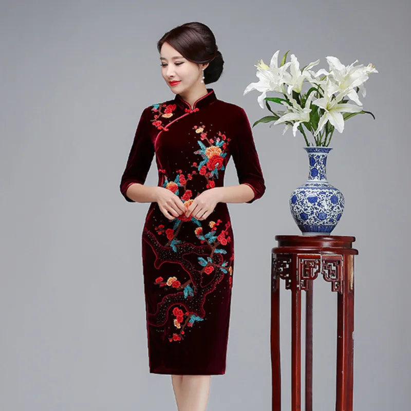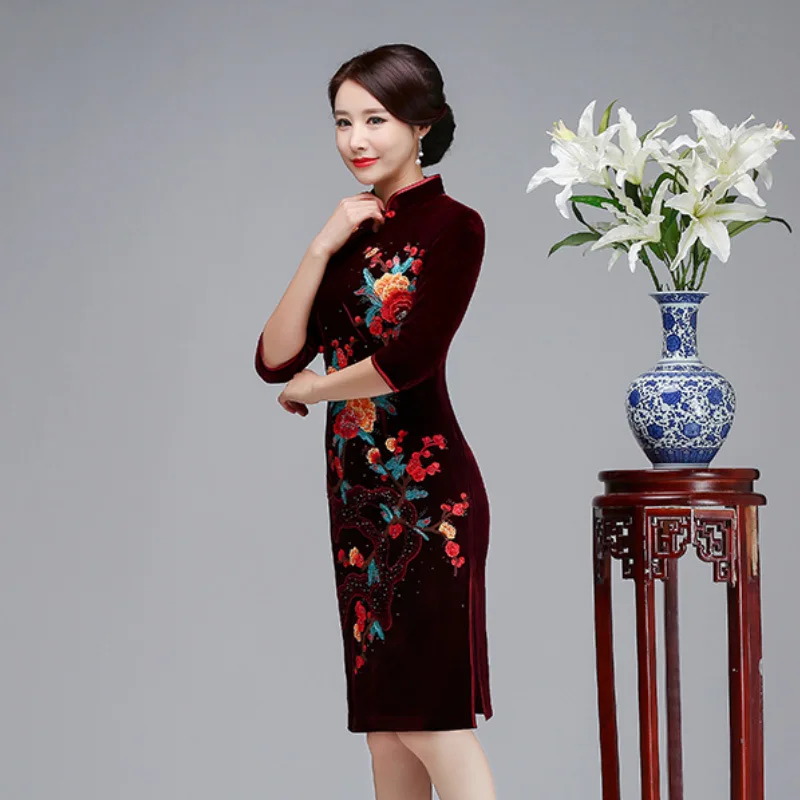 Buy New Autumn Fashion Wedding Banquet Embroidered Short Cheongsam Dresses for Middle-aged and Old Moth