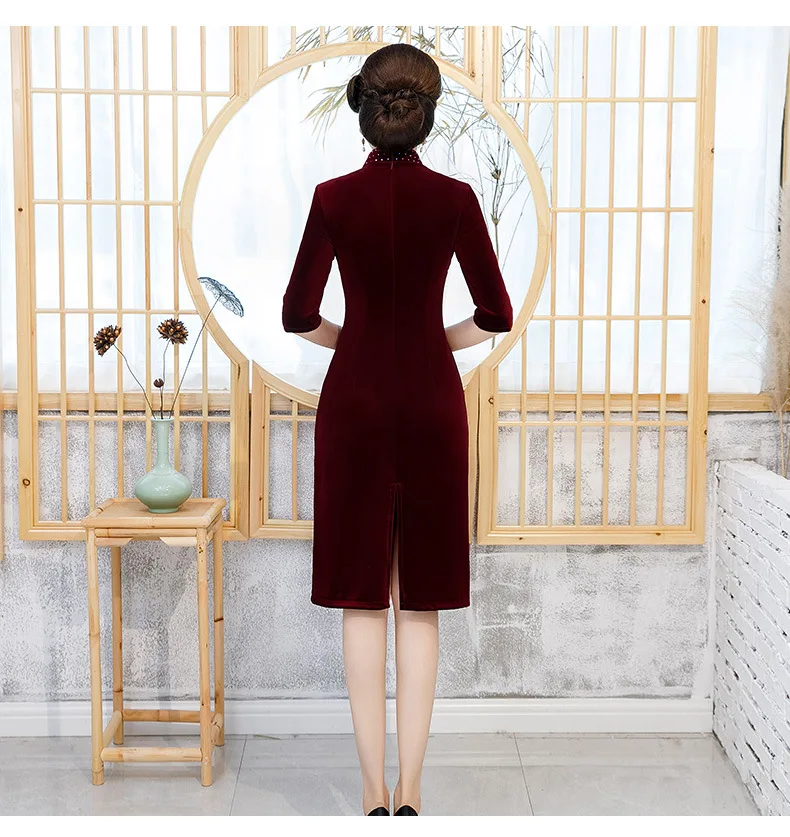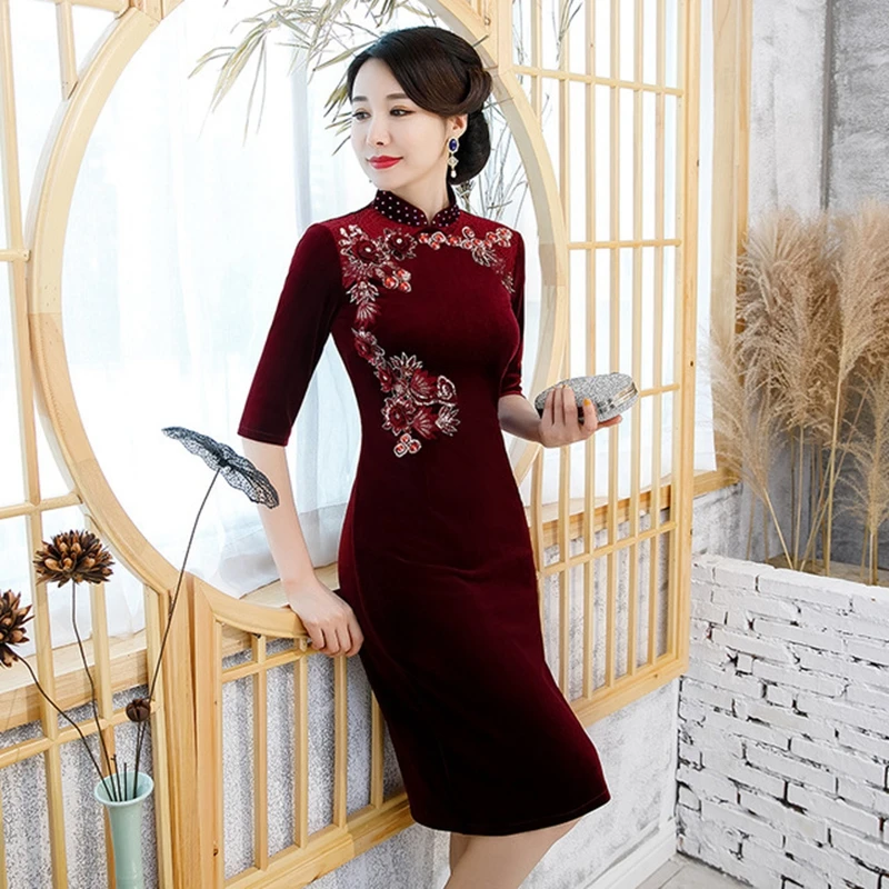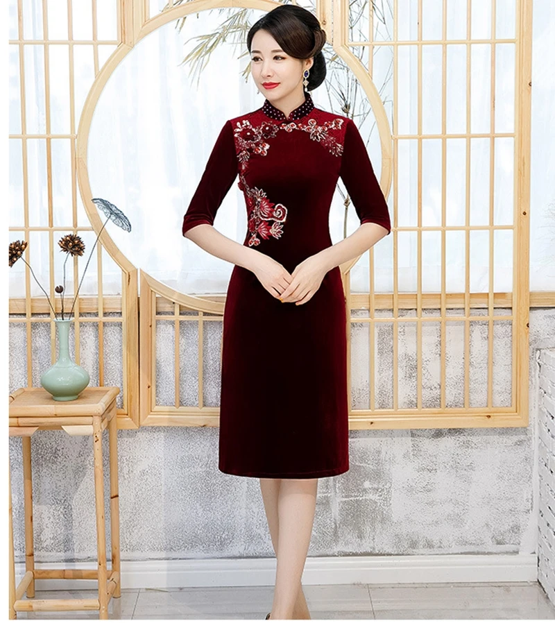 Cheap Autumn new dress gold velvet cheongsam embroidered bead long cheongsam mother dress wedding dress d