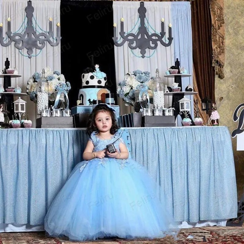 New Hot Sale Lace Applique Tulle Puffy Flower Girls' Dresses Capped Sleeves Long Floor Pageant Party We